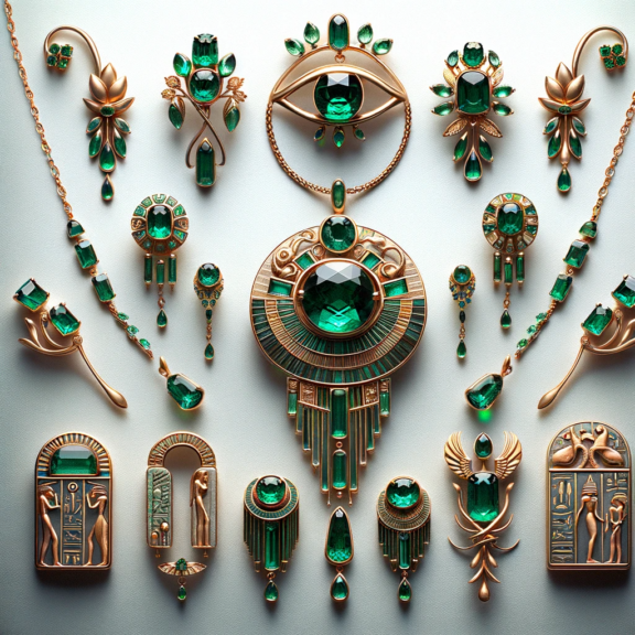 Colección con esmeraldas y circonitas verdes. Esta colección conserva el estilo de la realeza egipcia en una presentación más fina y delicada, adecuada para las esmeraldas de menor tamaño