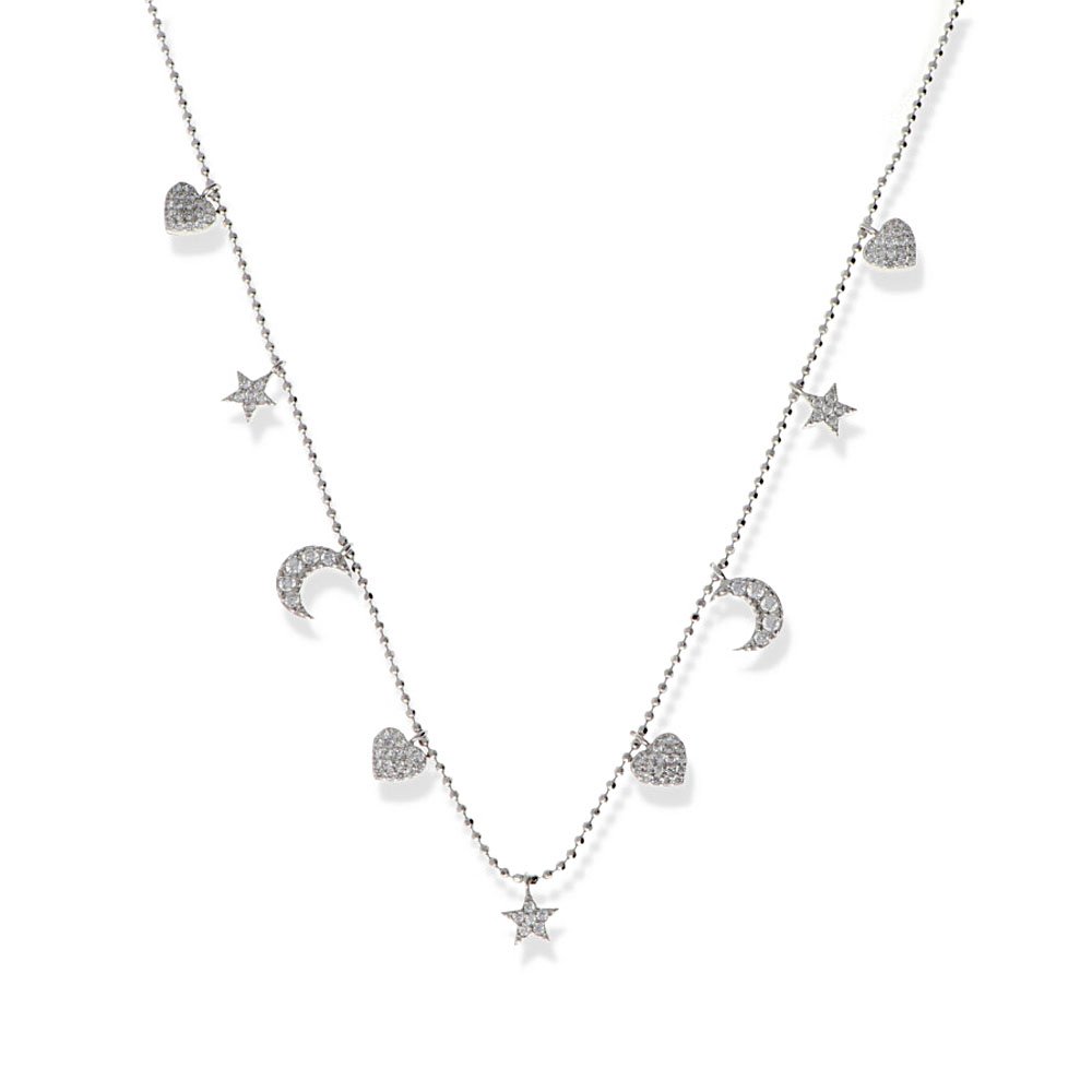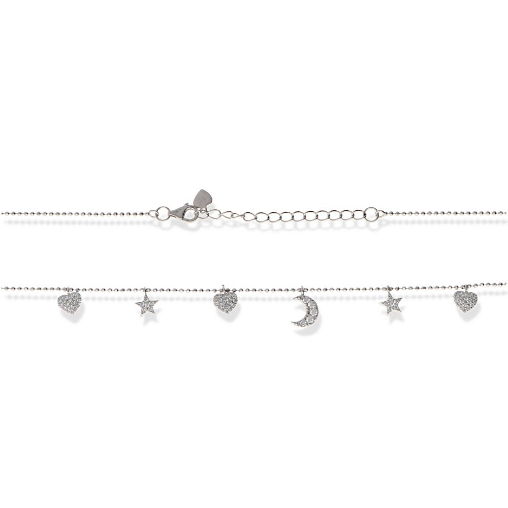 Gargantilla plata de ley 925 de circonita con colgantes de corazones, lunas y estrellas de 8mm y de 45cm de largo con cierre mosquetón.