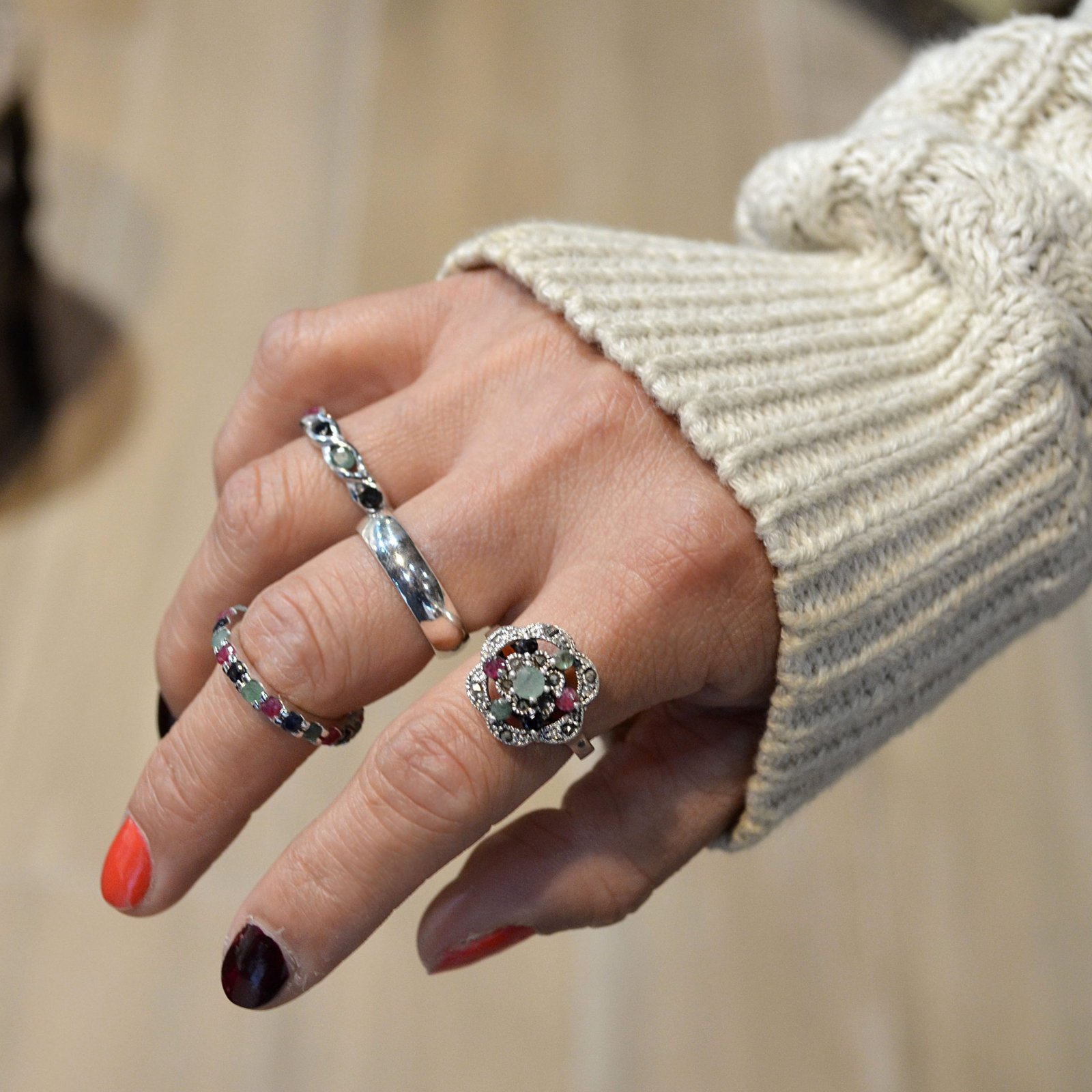 Anillo plata de ley 925 piedra preciosa en rubí, zafiro y esmeralda.