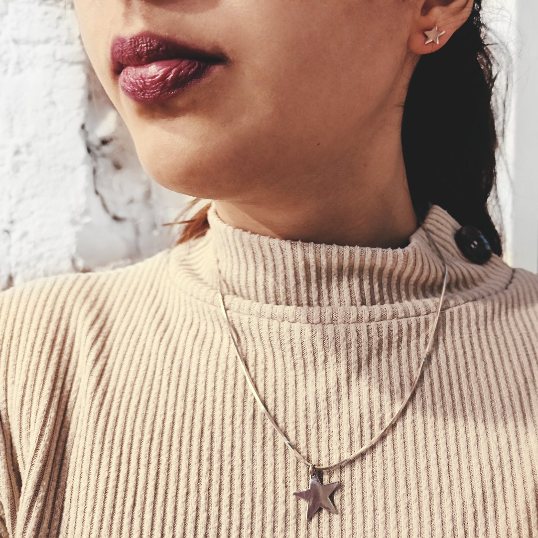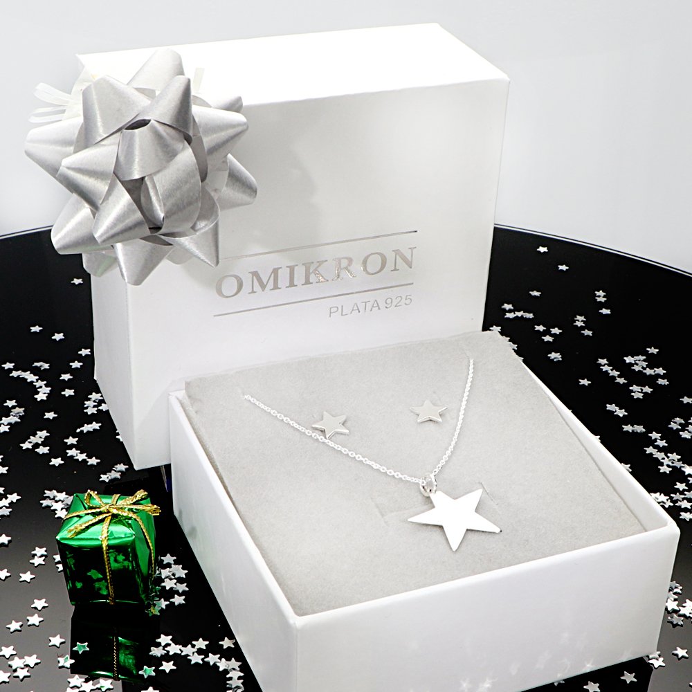 Conjunto plata de ley 925 estrella formado por pendientes 8,5mm con cierre a presión y colgante 18,5mm con cadena de 45cm de largo con cierre reasa.