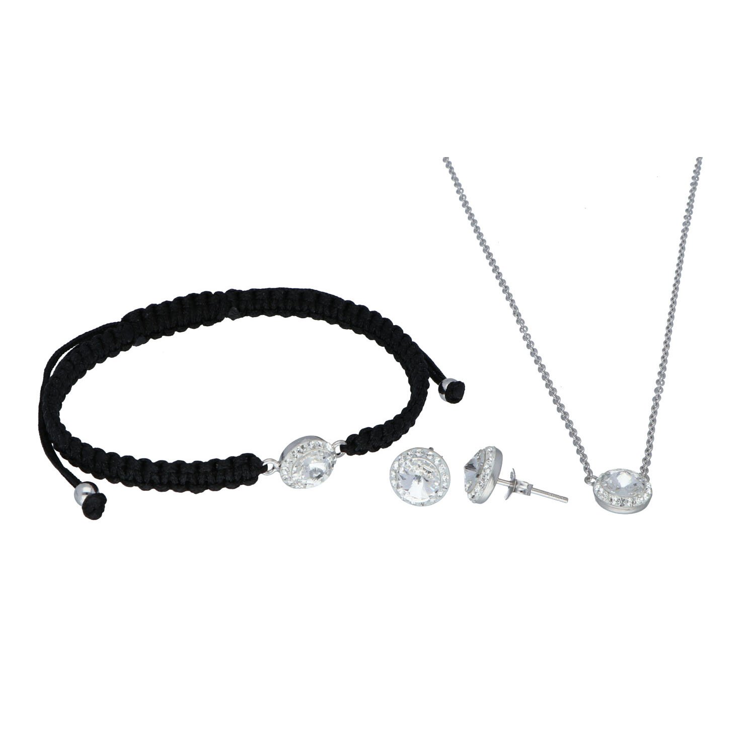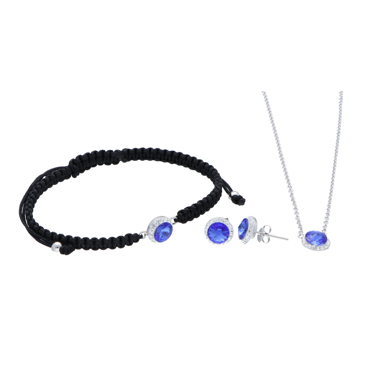 Conjunto swarovski de plata de ley 925 forma redonda de 8mm de diámetro en varios colores, compuesto por un par de pendientes con cierre de presión, pulsera de macramé de algodón ajustable y gargantilla con cadena de 45cm con cierre de reasa. Para mujeres con mucho estilo, de uso diario y también para ocasiones especiales.