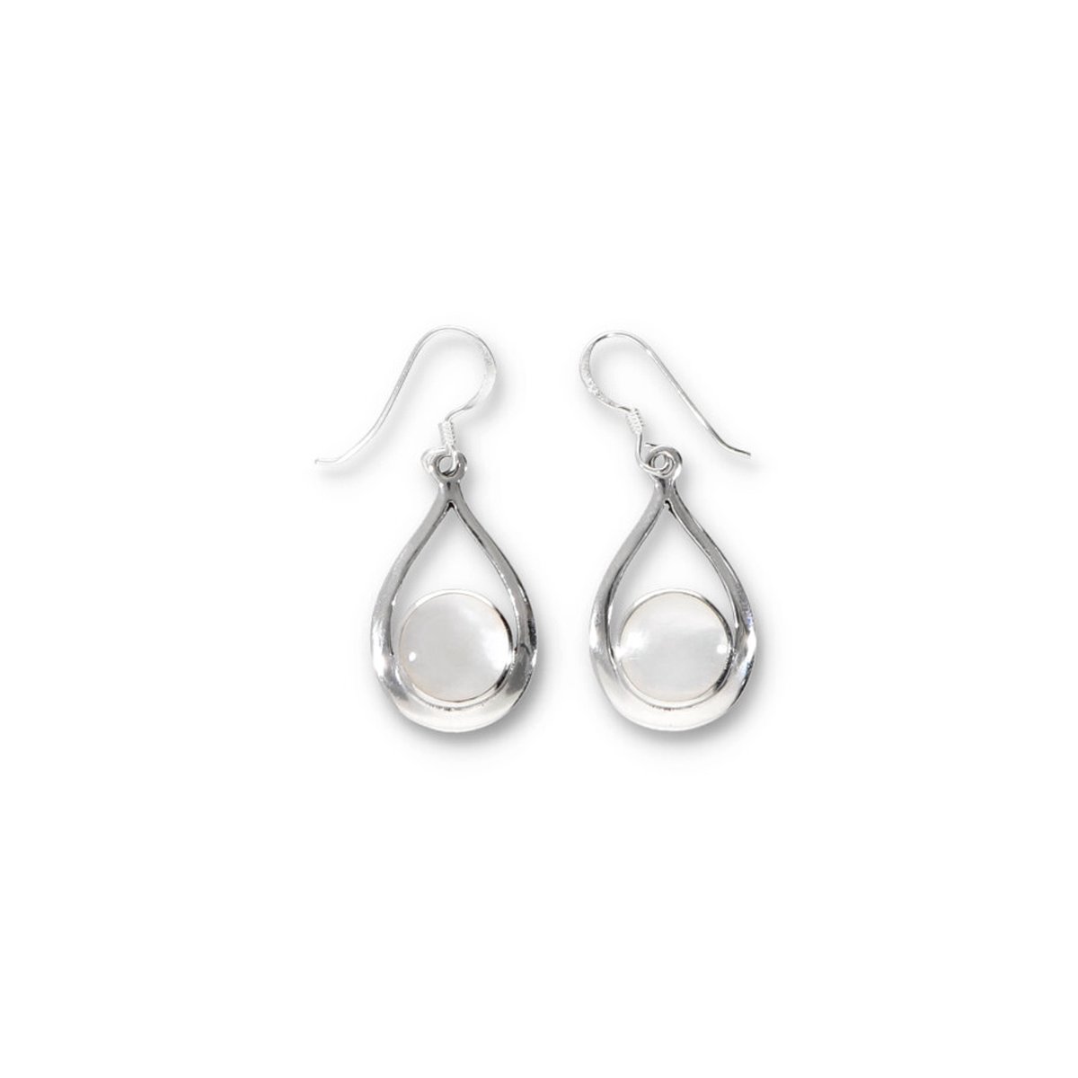 Pendiente plata de ley 925 en forma gota de piedra nácar. Cierre de hippie o de gancho.