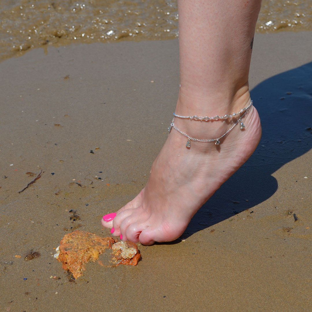 Tobillera de plata de ley 925 con circonitas de 27cm de largo y con cascabel al final.