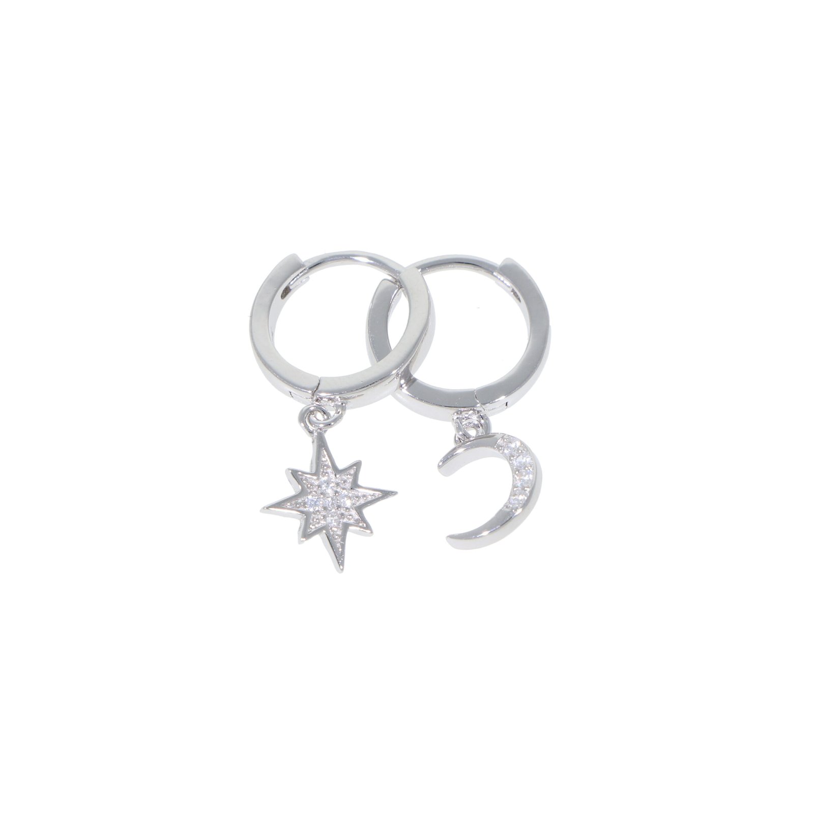 Pendientes en forma de aro, combinados con luna y estrella, ambas decoradas con circonitas brillantes, en plata de ley 925.