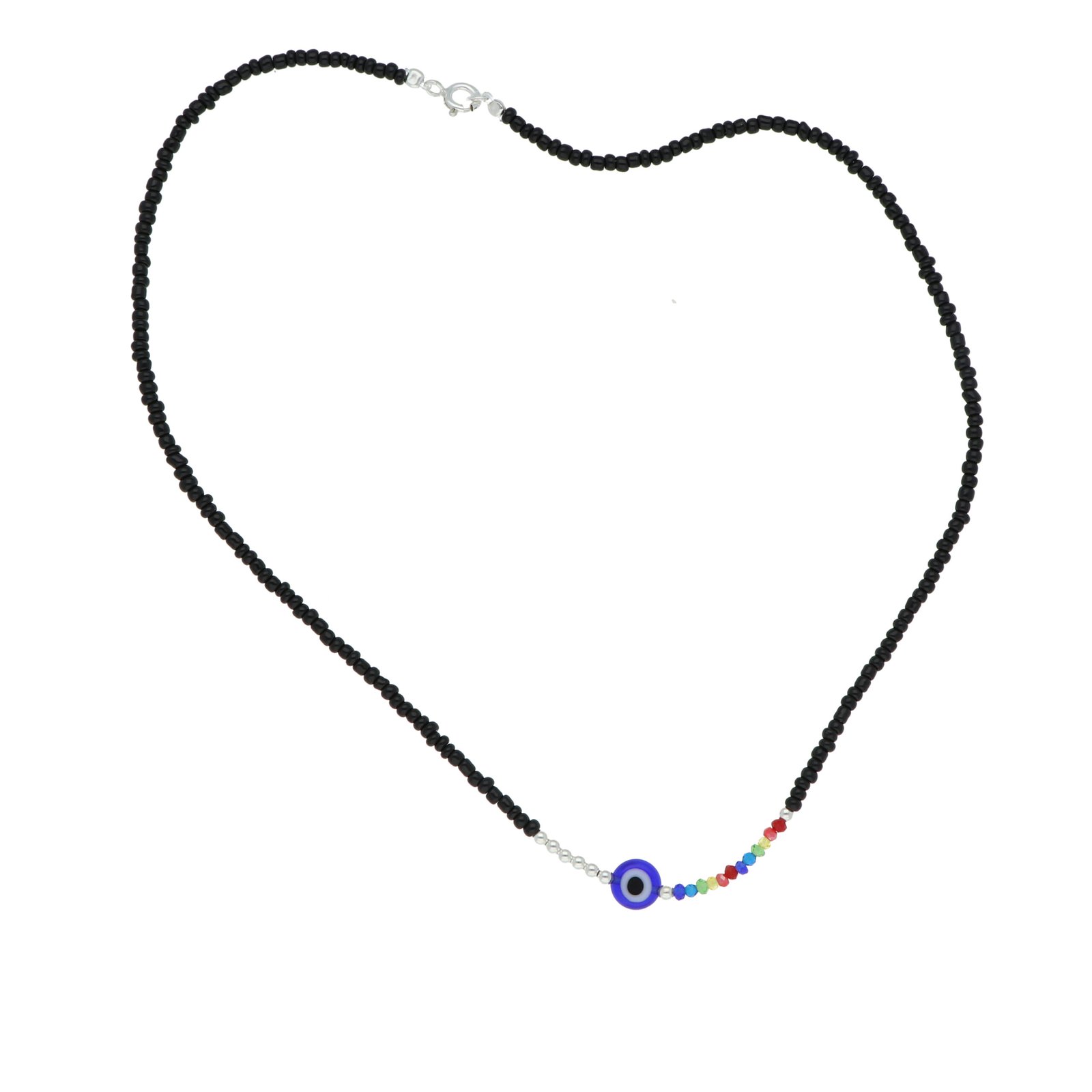 Diseño exclusivo que combina piedras negras, detalles plateados y multicolor, con un destacado colgante de ojo turco.