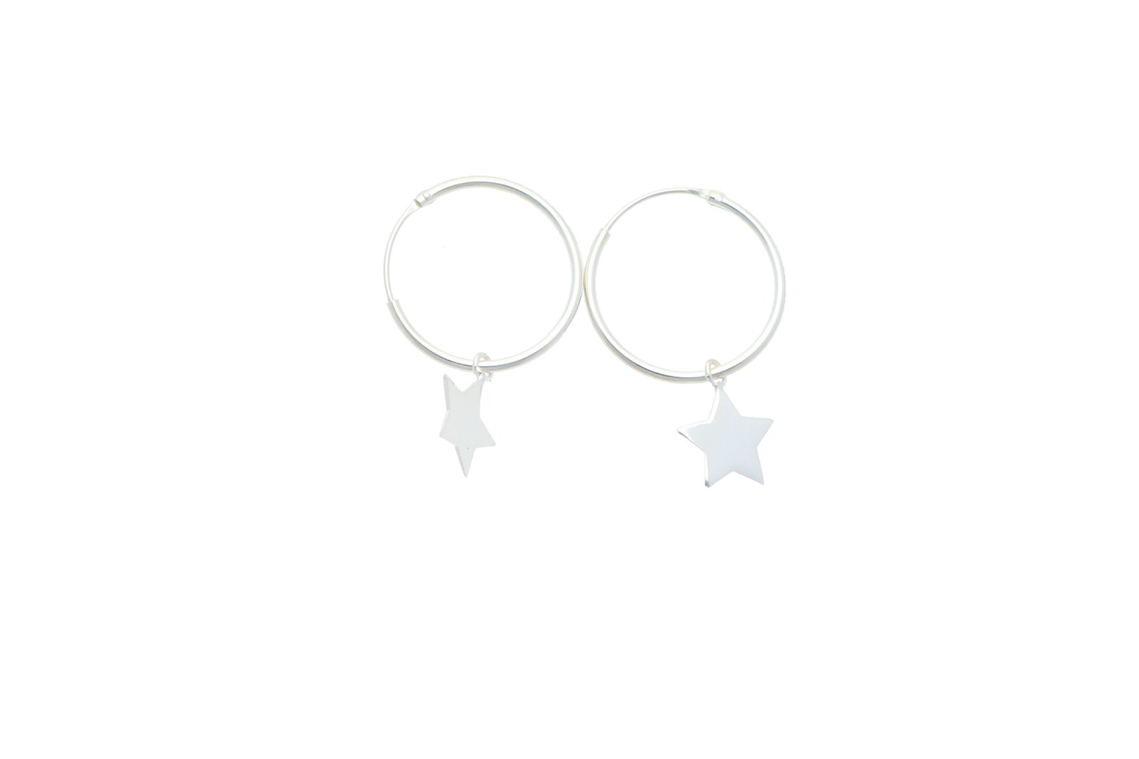 Aretes de aro en plata pulida, adornados con un colgante en forma de estrella. Este diseño captura la esencia del cielo nocturno y el misterio del universo. Las estrellas, brillantes y pulidas, reflejan la luz maravillosamente, haciendo que estos aretes sean un complemento perfecto para cualquier atuendo. Son ideales para quienes aman soñar y mirar las estrellas, llevando un pedacito del firmamento consigo.