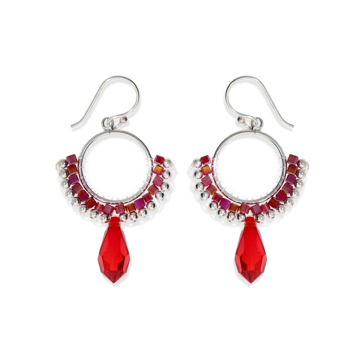 Pendientes de plata de ley 925 círculo de 15mm de cuentas con cubos rojos y bolitas de plata de 2,5mm y colgante rojo de 14mm con cierre hippie.