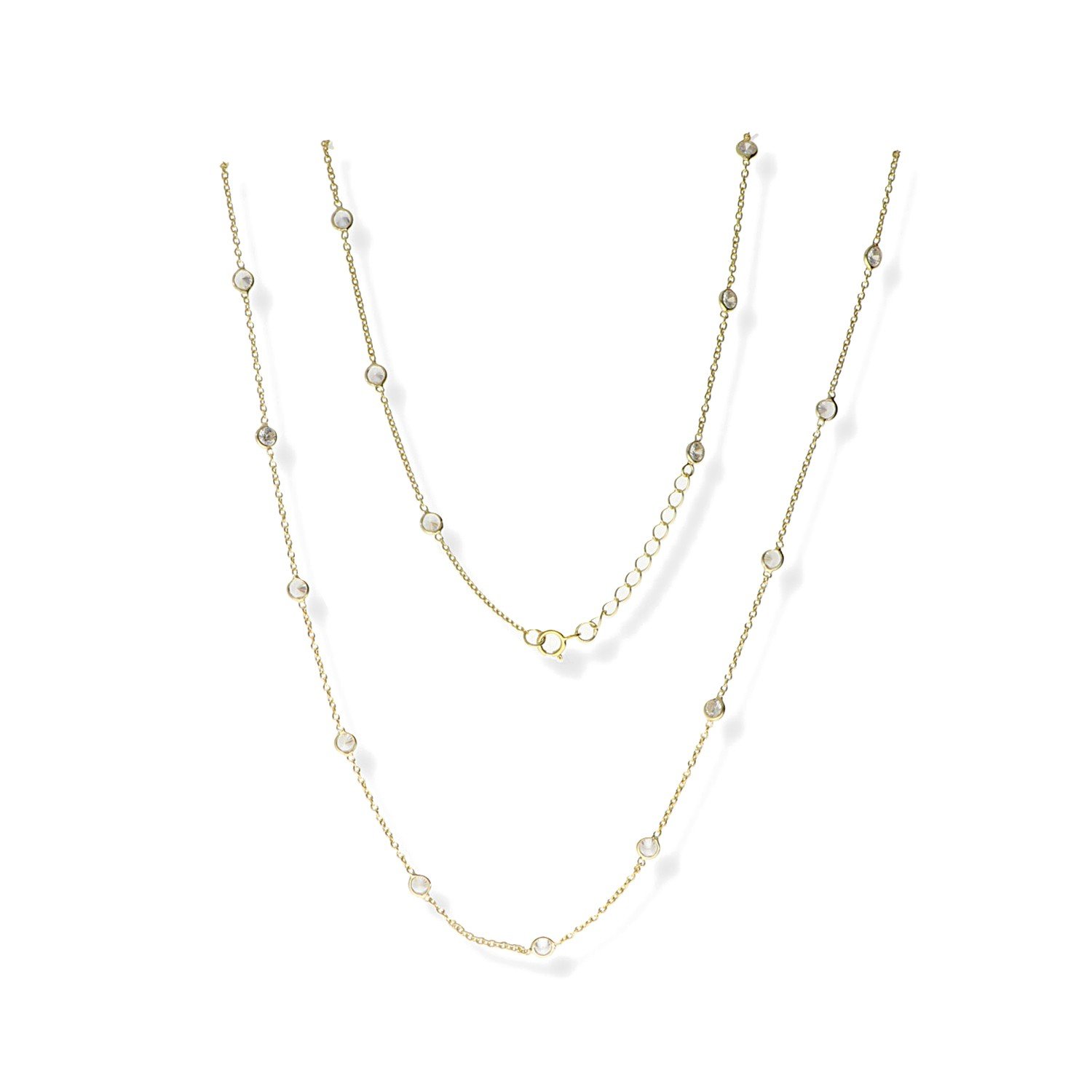 Collar de plata de ley 925 con baño de oro de 18 quilates con circonitas de 4mm de 85cm de largo con cierre reasa.