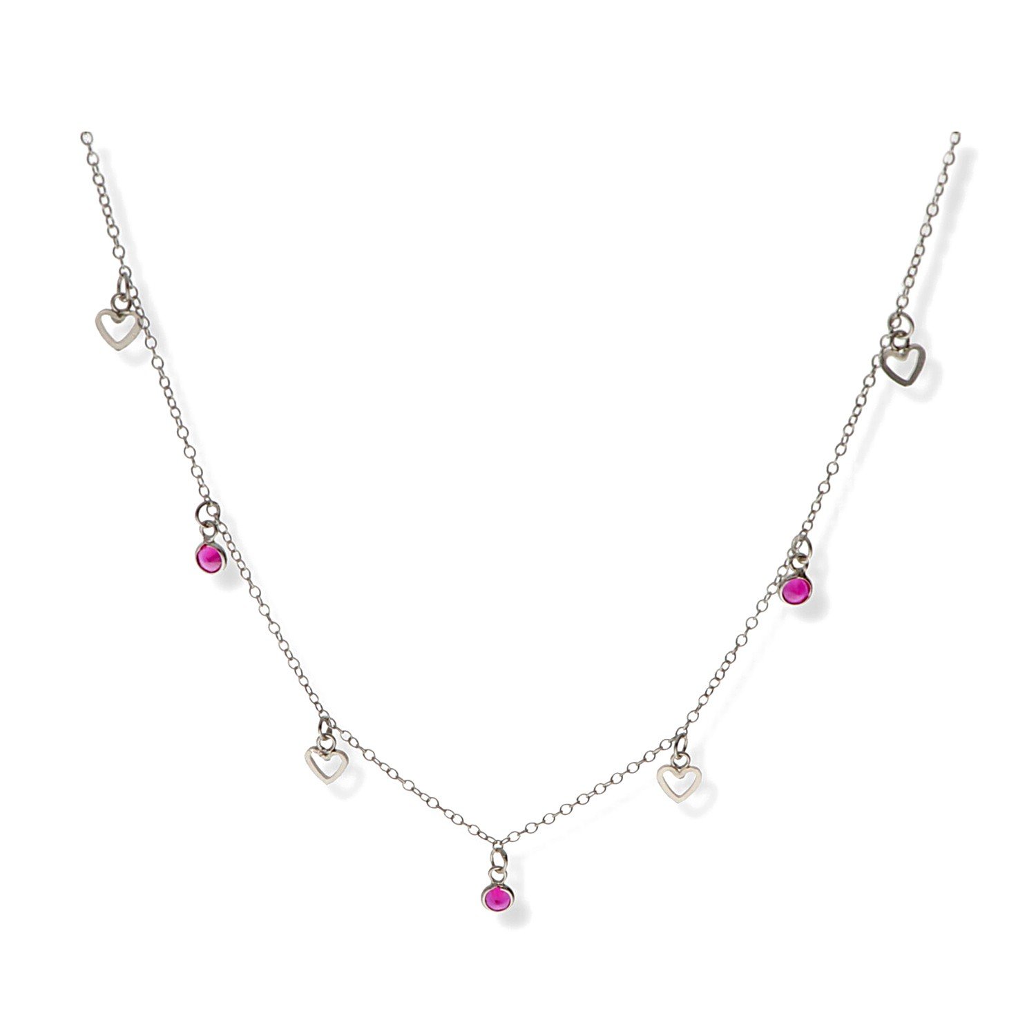 Gargantilla de plata de ley 925 con circonitas fuchsias de 4mm y corazones de 4,5mm de 48cm de largo con cierre reasa en varios colores;