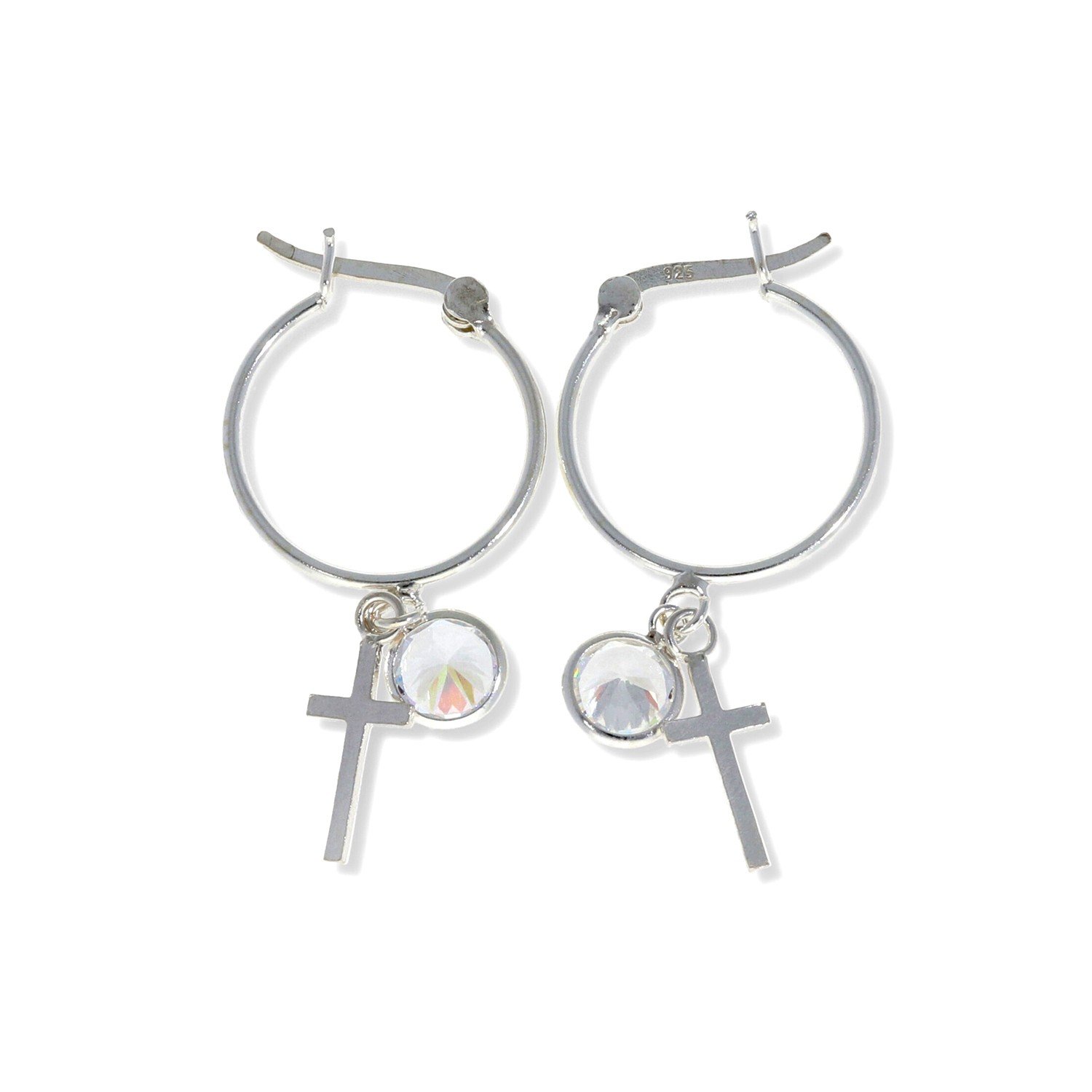 Pendientes de plata de Ley 925 con aro de 1x18mm y colgante de cruz de 6x15mm y circonita de 7mm.