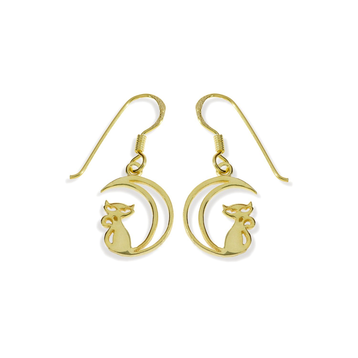 Pendientes de plata de ley 925 con baño de oro de 18 quilates con gato en la luna de 15mm y cierre hippie.