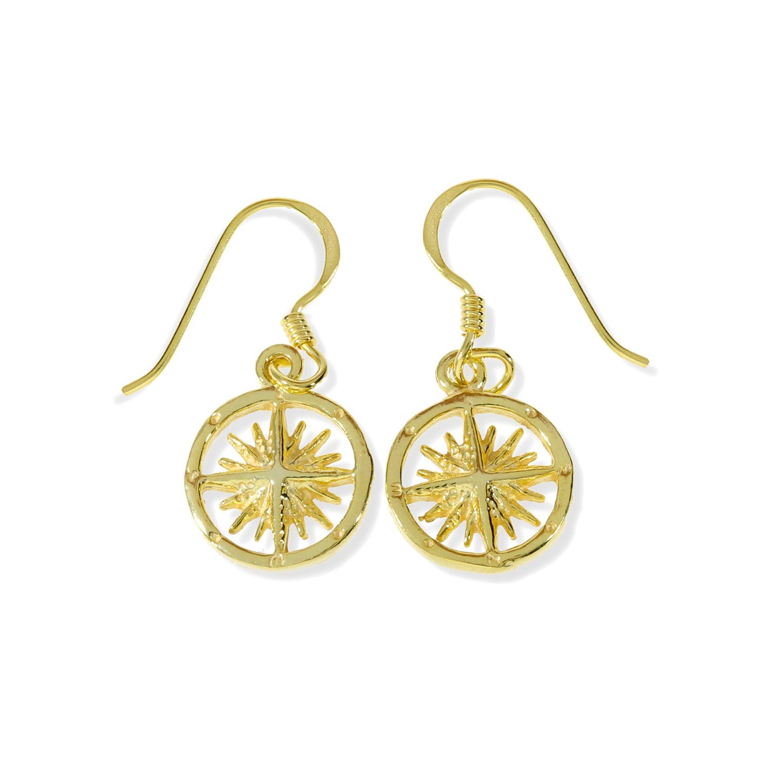 Pendientes de plata de ley 925 con baño de oro de 18 quilates con rosa de los vientos 11mm y cierre hippie.