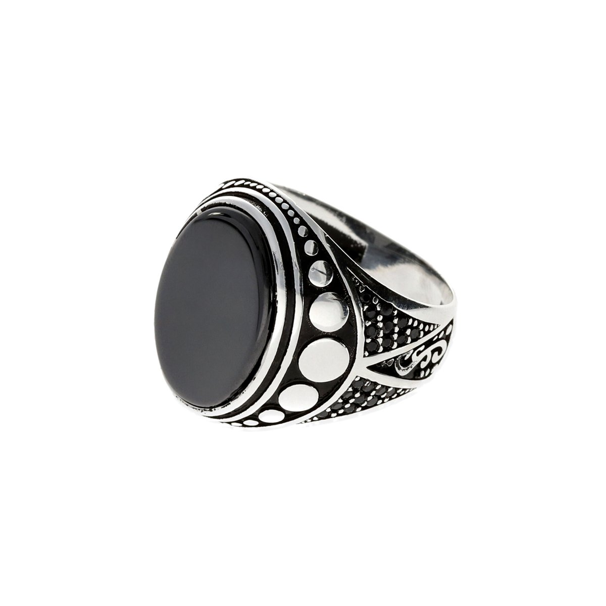 Anillo de plata de ley 925 para hombre tipo sello ovalado onix 14x18mm con circonitas negras.