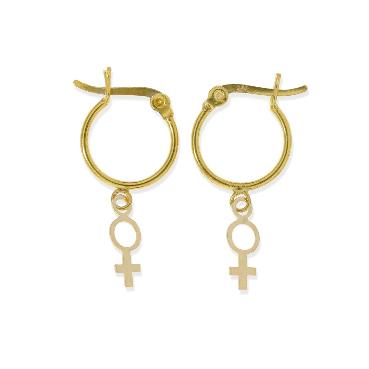 Pendientes de plata de ley 925 dorados con baño de oro de 18 quilates con aro de 1,2x14mm y colgante símbolo mujer de 10mm.