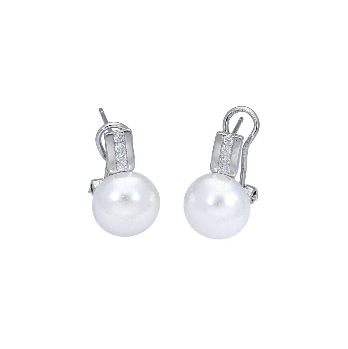 Pendientes de plata de ley 925 con perla (shell) 10mm y circonita con cierre omega.