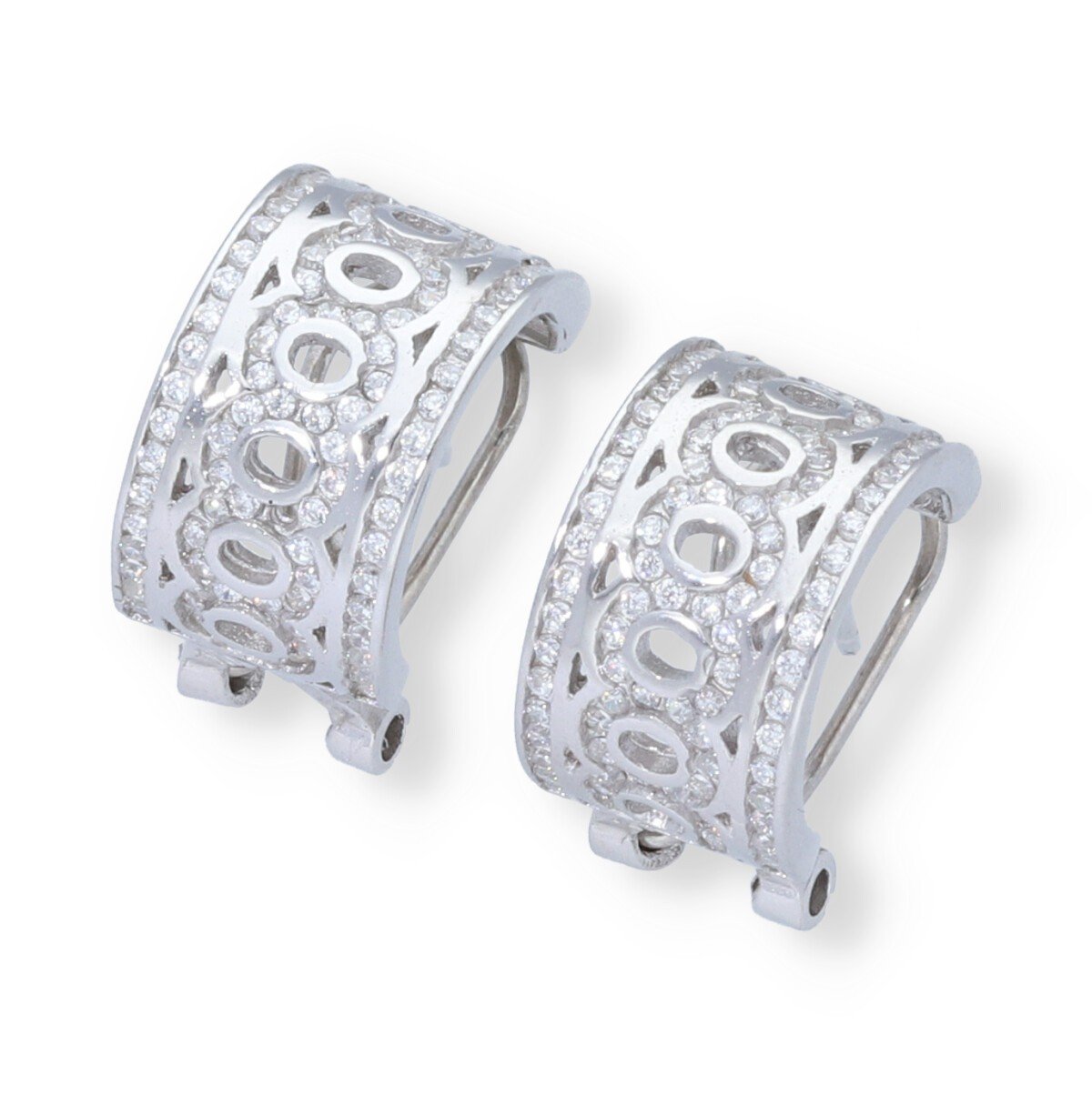 Pendientes de plata de ley 925 semiaro con troquelado de círculos con circonitas de 8x15mm y cierre omega.